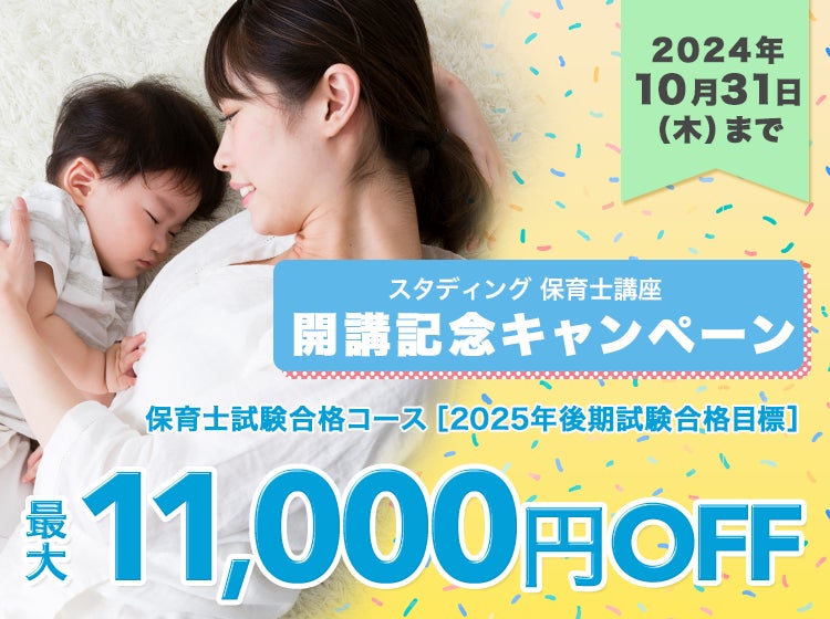 保育士講座の開講を記念して、多くの方にご利用いただけるよう「開講記念キャンペーン」を実施いたします。