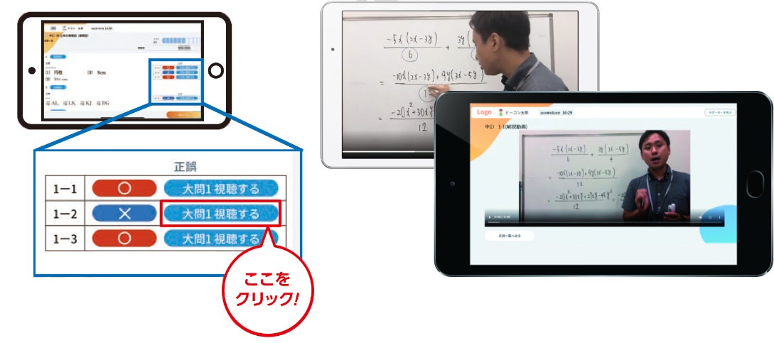 学習に使用するのは学研グループのカリスマ講師による高品質な映像授業。各単元別、レベル別に多数のコンテンツが準備されています。また、視聴するだけではなく、「ポイントをノートにまとめる」「問題を解く」など授業に集中できるよう組み立てられているので、聞き逃しや理解が不安な部分、復習したい箇所が一人ひとりに合わせて見ることができます。