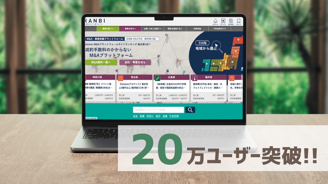 株式会社トランビ(本社:東京都港区、代表取締役:高橋聡)は、事業承継・M&Aマッチングプラットフォーム「TRANBI」のユーザー数が20万者を突破したことをお知らせいたします。