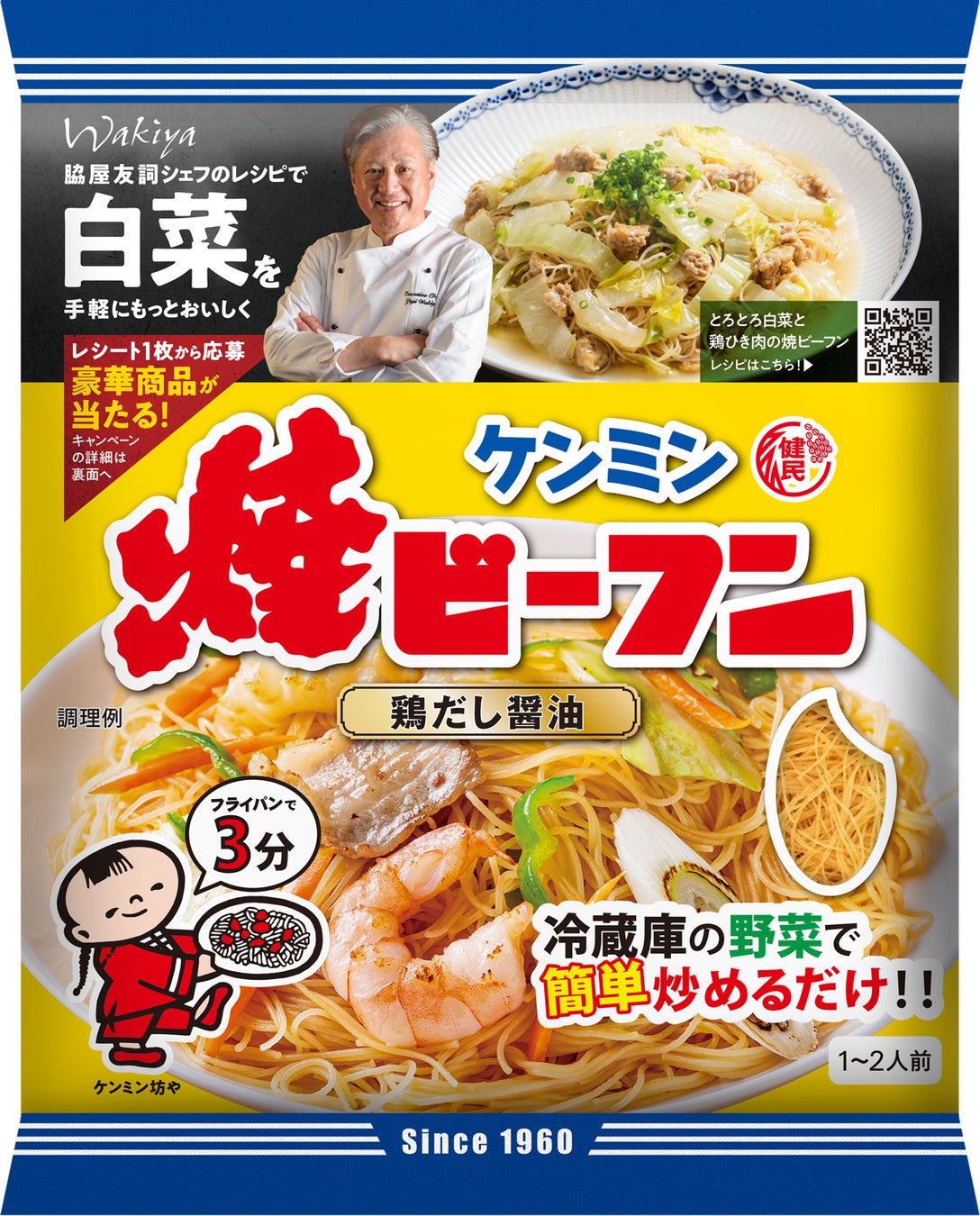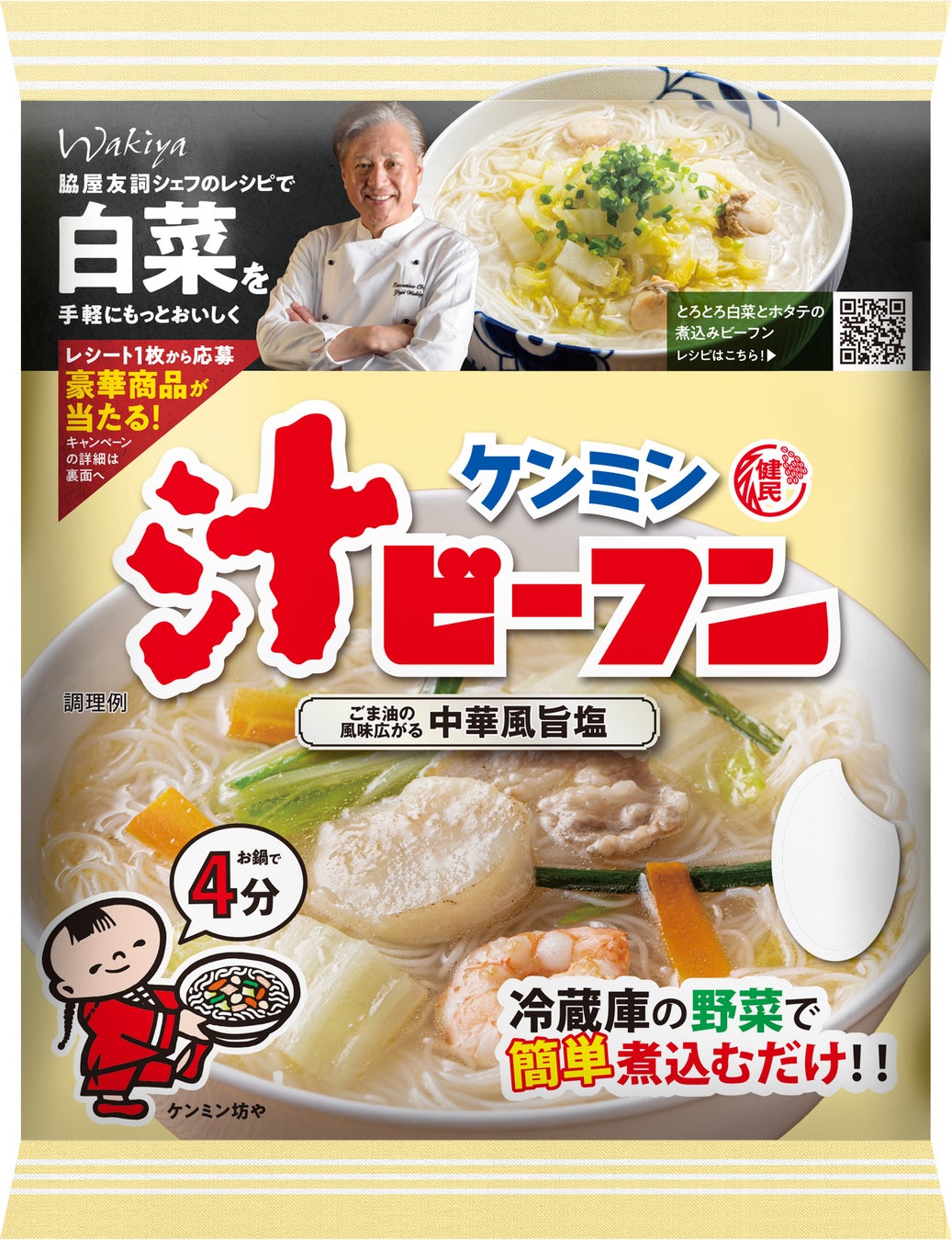 キャンペーン期間中は、「ケンミン焼ビーフン」「ケンミン汁ビーフン」約250万袋のパッケージに脇屋シェフが考案した、白菜、白ねぎ、きのこを使ったレシピを掲載します。野菜と相性抜群のビーフンを通して鍋野菜を使った簡単で本格的な美味しい食べ方を提案し、鍋野菜の消費拡大に貢献します。