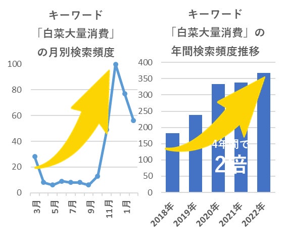 ●秋以降、徐々に気温が下がっていくと鍋料理への注目が高まります。10月から急激に鍋野菜の消費方法についての検索数が高まり、年間検索頻度は2018年以降4年間で2倍に増えています。