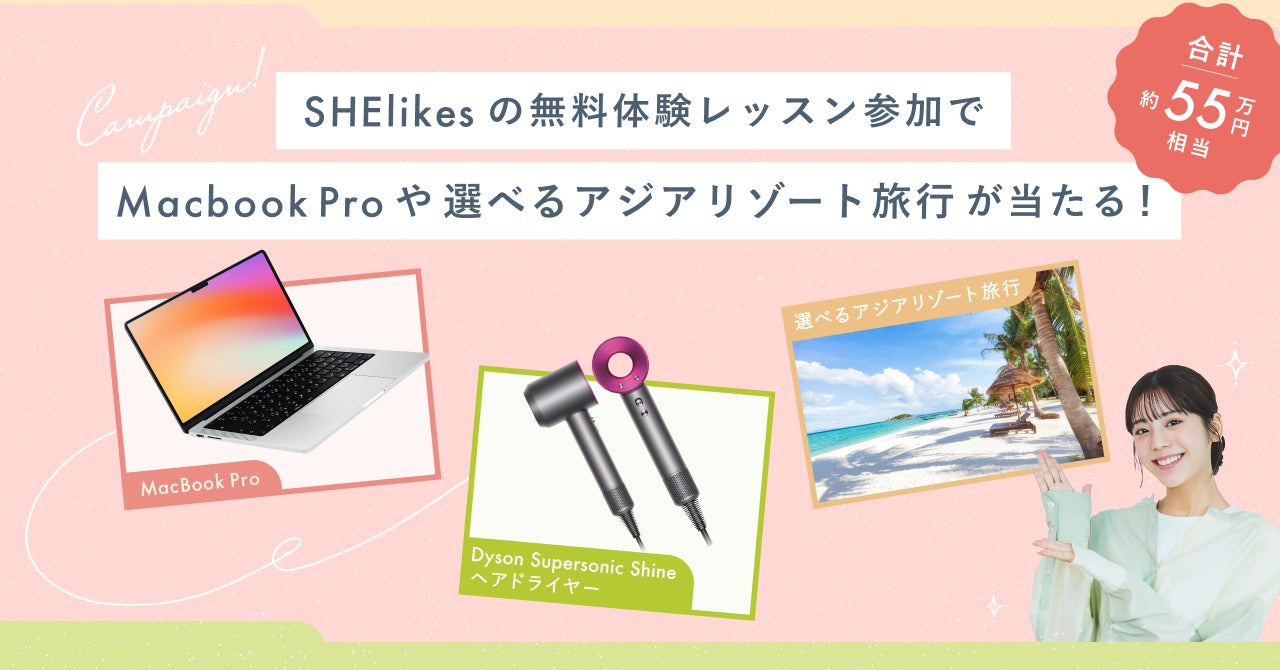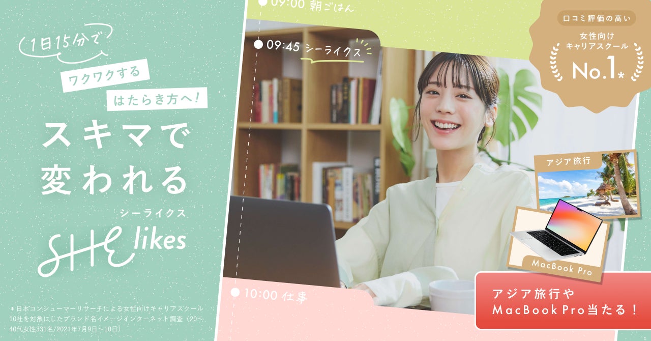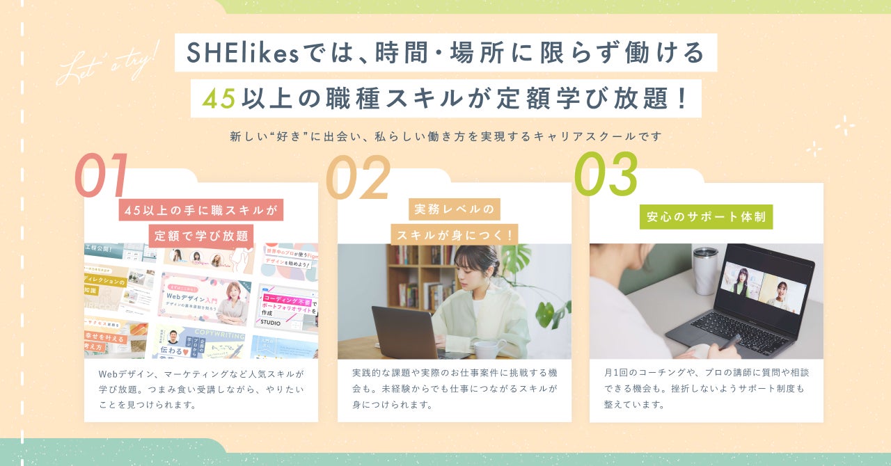 SHElikesは、時間や場所にとらわれずに働ける45以上の職種スキルが定額学び放題の女性向けキャリアスクールです。Webデザイン・Webマーケティング・ライティングなどパソコンひとつで働けるデジタルスキルやクリエイティブスキルを学ぶことで、私らしい働き方の実現を支援します。