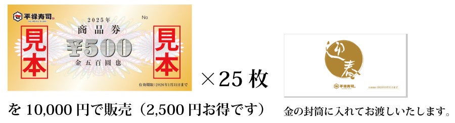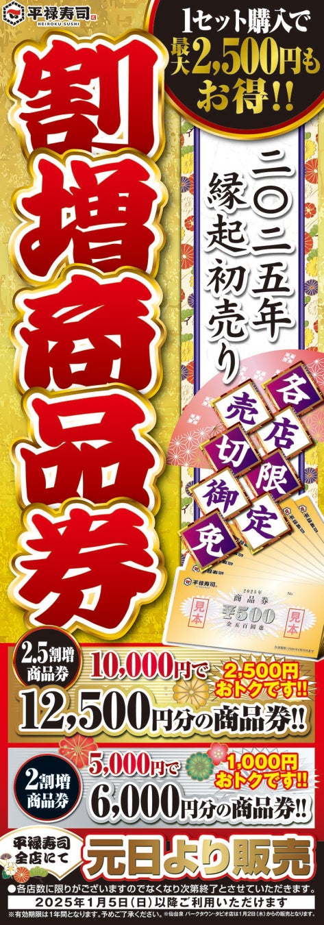 回転寿司のパイオニア「平禄寿司」では、新年・元日(※)よりお得な「割増商品券」を35店舗で販売いたします。①10,000円で12,500円分の商品券。②5,000円で6,000円分の商品券の2種類で有効期限は2025年1月5日(日)より2026年1月31日(土)まででございます。各店・枚数限定の商品券でなくなり次第販売終了となります。どうぞ、お早めに各店舗でお求めください。新年の初売りでスタッフ一同お待ちしております。