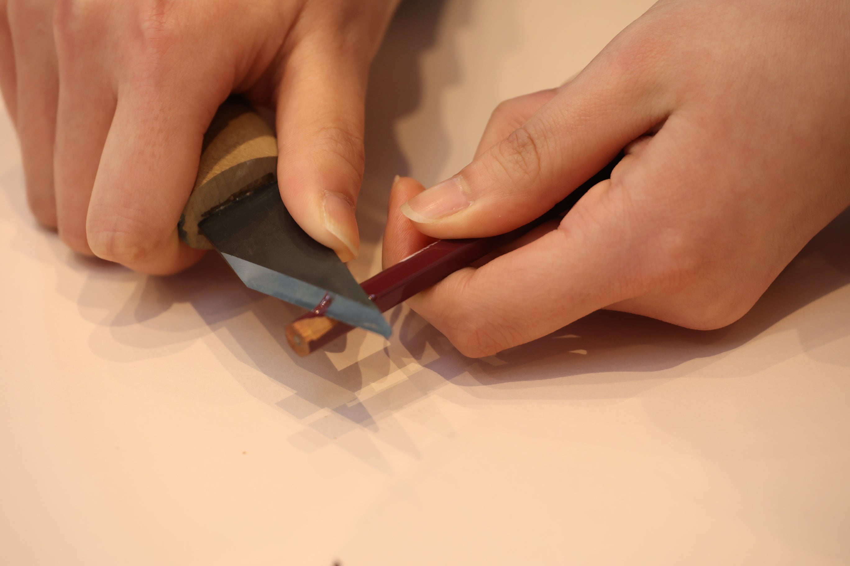 ✏ 先輩社員が手本を披露した後、新入社員が再び鉛筆を小刀でけずります。