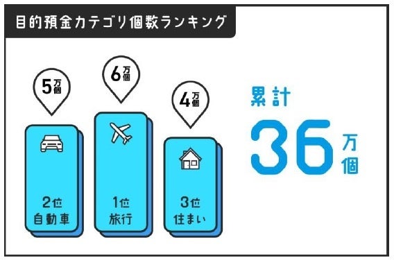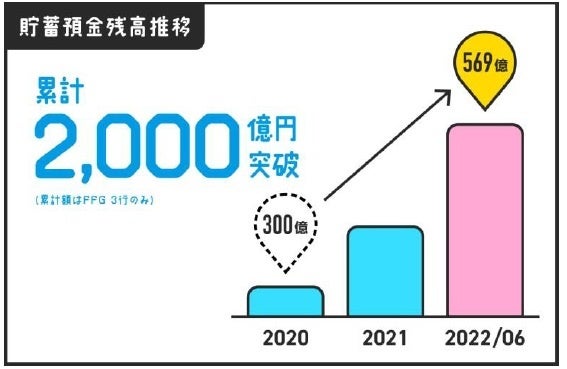 貯蓄預金は累計2,000億円(FFG3行のみ)を突破し、残高は2020年の300億円突破から、2年間で倍近くの残高が積み上がるなど大幅に増加中です。目的別に作成できる目的預金は、旅行・自動車・住まいといったカテゴリで多く作成されており、目的預金は累計36万個となりました。