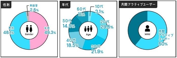 Wallet+のユーザーは性別に偏りはなく、年代別では、20~30代をメインとして、幅広い年代にご利用いただいております。また、月間アクティブユーザーは6割と、利用率の高いアプリです。