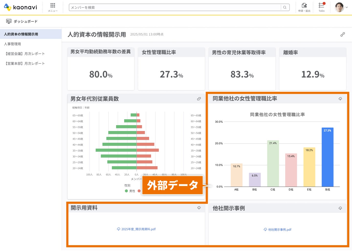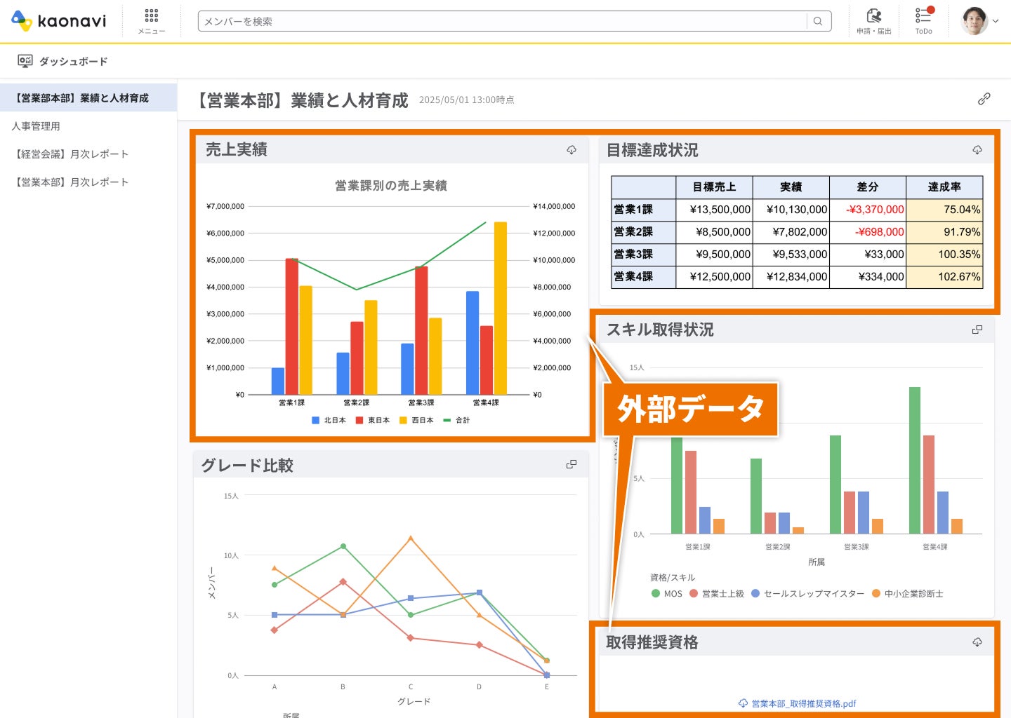 こうした状況の下、グラフや数値を用いて直感的に現状を把握できるダッシュボードの有用性が高まっています。当社はこの変化に応え、「カオナビ」の内部データに限定していたダッシュボード機能を進化させ、外部データのアップロードを可能にしました。これにより、業界全体のマクロ情報との比較、別システムのデータを用いた多角的な分析など、統合的な視点による分析を実現できます。