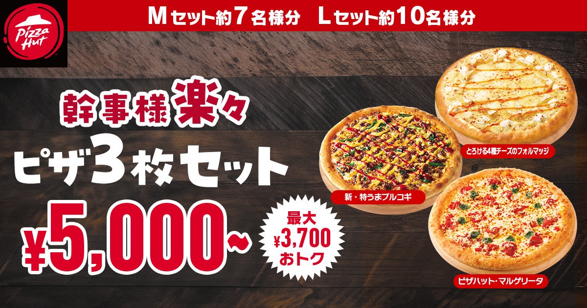1つ目は、「ピザハット・マルゲリータ」「新・特うまプルコギ」「とろける4種チーズのフォルマッジ」という定番人気ピザ3枚がセットになって、最大3,700円OFFとなる「幹事様楽々 ピザ3枚セット」。