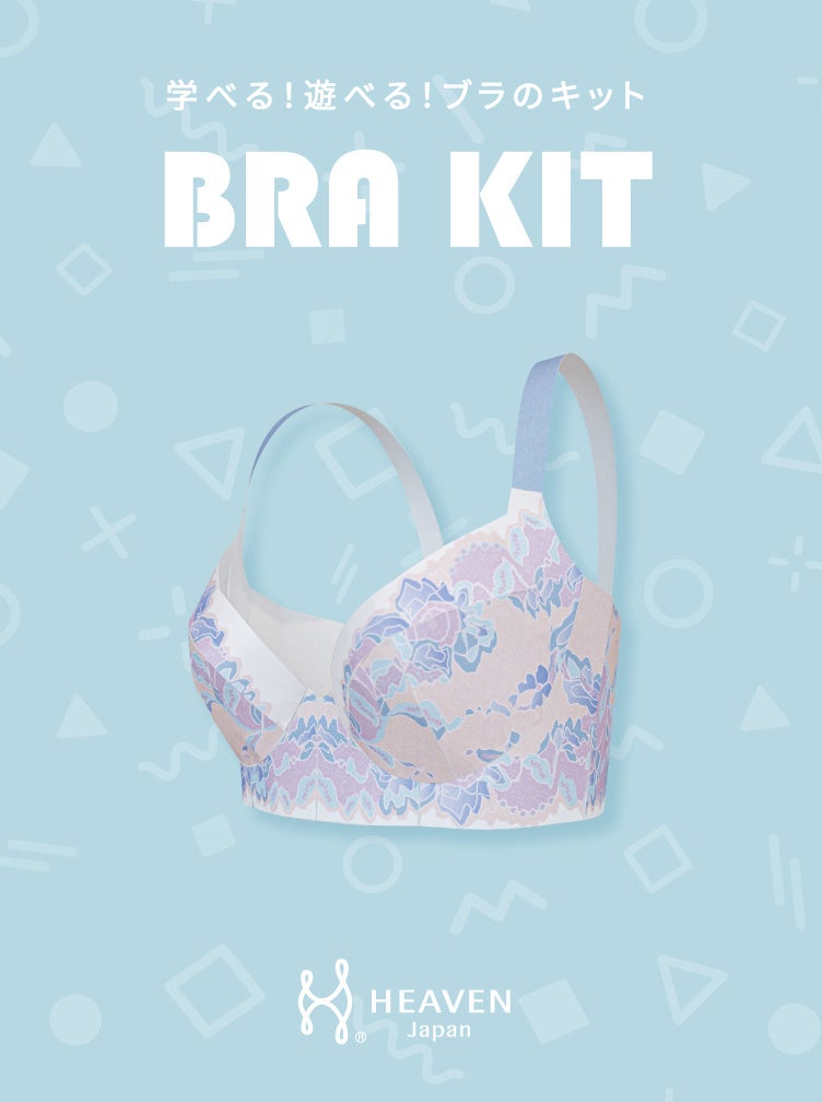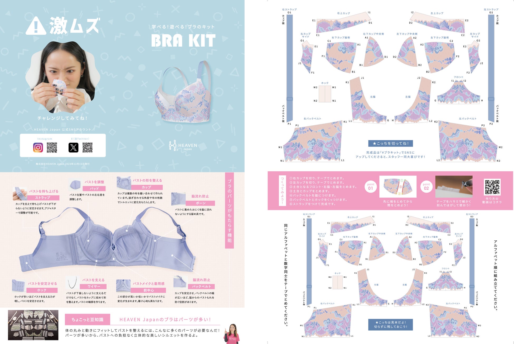 「ブラキット」は、そんなパターン製作のことや、ぴったりとした着け心地を叶えるためのブラジャーを構成するパーツの多さ、ブラジャーをバストやからだの曲線にぴったりと沿わせることの難しさを一般の方にも知って欲しいという想いからHEAVEN Japanスタッフが企画した、下着業界でもめずらしい手のひらサイズのブラジャー紙工作キットとなります。