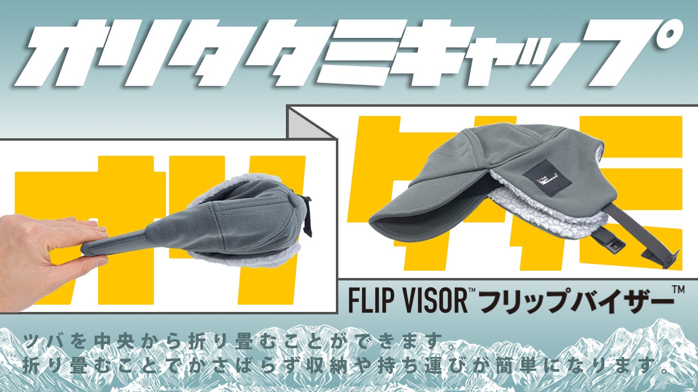 「FLIP VISOR®(フリップバイザー)」は、コンパクトに収納できる折り畳みの帽子を展示します。耳当て付きのフライト帽子で、3段階の温度調整が可能です。