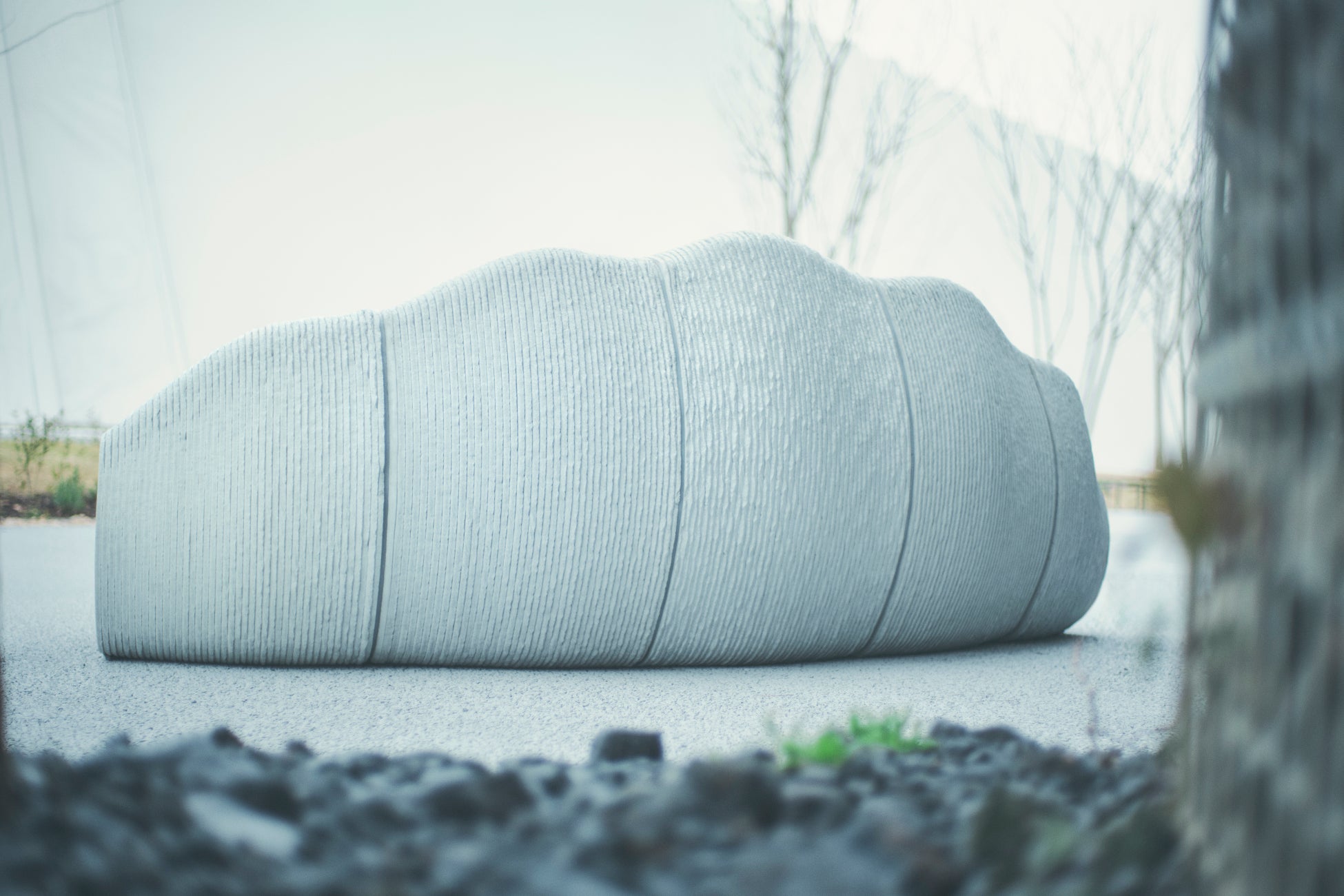 「HOTABENCH(ホタベンチ)」は、約1,000枚(40kg)もの廃棄貝殻を砂の代替素材として再利用し、型枠不要の3Dプリント技術を用いることで、従来のコンクリート製ベンチに比べ約300kgのCO2削減を実現したサステナブルなプロダクトであり、バイオミミクリーに基づきホタテの構造を模倣した特殊なリブ形状や、あえて表面に残した積層痕によって自然が生み出した資源循環を美しく体現しています。