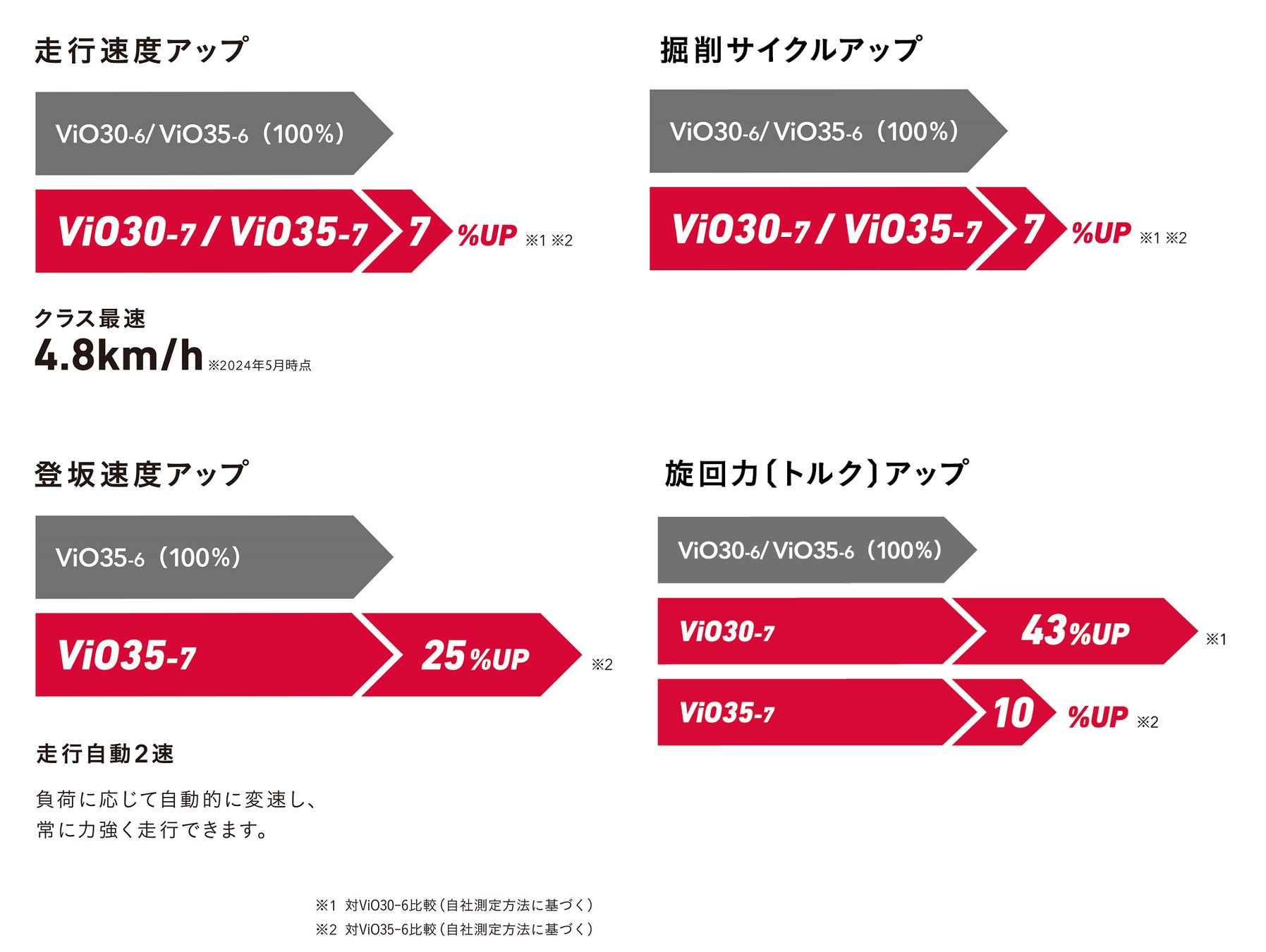 本機は、油圧ショベルの人気シリーズ3tクラス「ViO30-6C」と3.5tクラス「ViO35-6C」のモデルチェンジ機です。従来機に比べ、走行モーターの改善によって平坦地での最高速度が7%向上しました※1※2。また、「ViO35-7」は、油圧ポンプの改善により、登坂速度が最大25%向上※2し、さらに掘削のサイクルタイムが7%短縮しました※1※2。