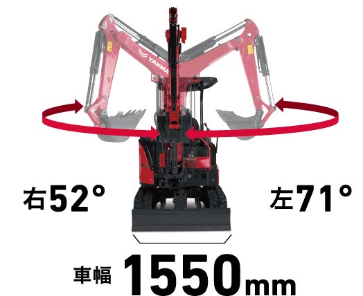 ・車幅1,550mm、最小フロント旋回半径1,630mmのコンパクト設計に、ブームスイング角度の改善も加えることで、狭小な現場でも掘削、旋回、積み込み作業が可能。