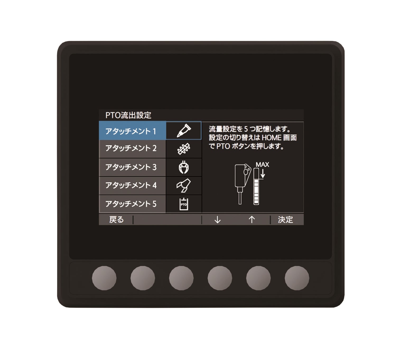 ・4.3インチカラー液晶モニターの採用により、稼働状況や異常状態などの視認性が向上。AUX2仕様をオプション設定することで、モニター画面からアタッチメントごとの油圧流量を5パターンまで設定できます。