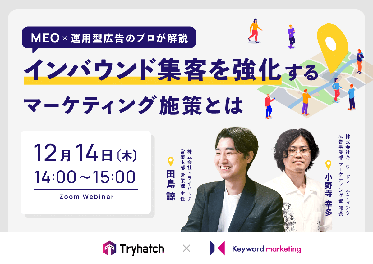 今回は、地図アプリや検索エンジンを利用し訪日外国人を集客する手法を学んでいただけるセミナーを、インバウンド集客を強化するMEOツール「インバウンドMEO」を提供しているトライハッチと、運用型広告に強みを持つキーワードマーケティングの共同で開催します。