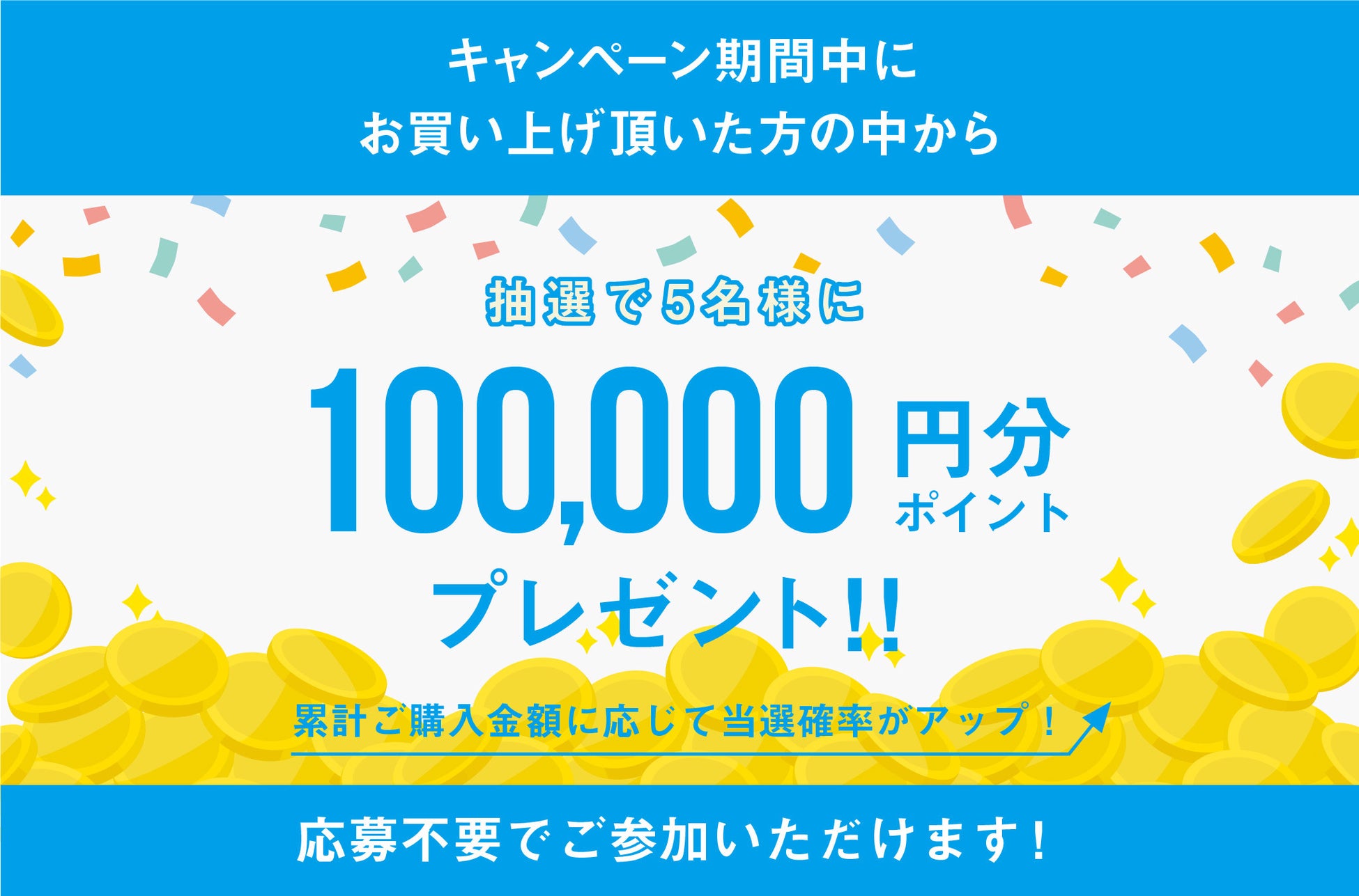 抽選5名様にWWSオンラインストアで使用できるポイント10万円相当分が当たります。期間中の購入総額10,000円(税込)ごとに応募口数が増加し、当選確率がアップします。1円~10,000円(税込)は1口、10,001円~20,000円(税込)は2口のように増加します。応募可能口数の上限はありません。