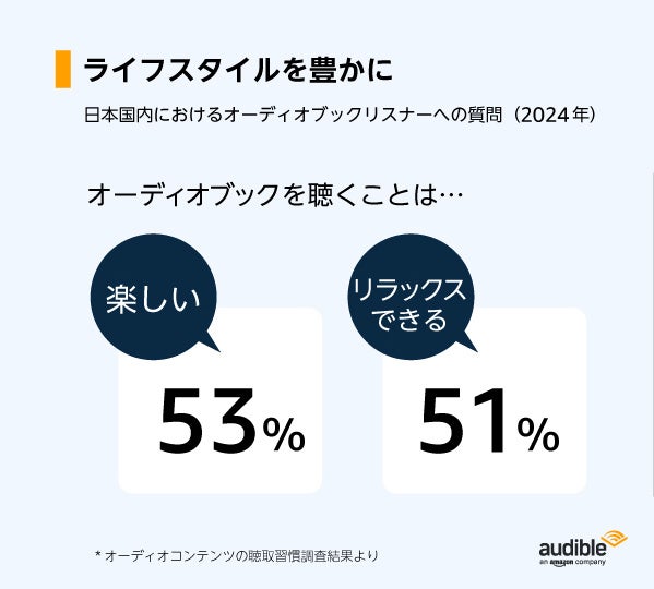 オーディオブックは、単なる「聴く」体験を超え、リスナーの日常生活を豊かにしています。2024年の本調査では、日本国内におけるオーディオブックリスナーのうち、53%が「オーディオブックを聴くことは楽しいか?」という質問に肯定的に回答し、さらに51%が「リラックスできるか?」という質問に肯定的に回答しています。