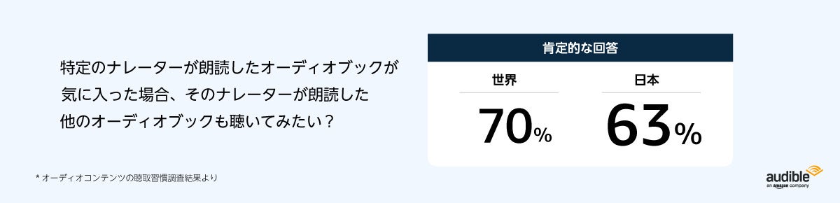 注:市場調査機関Varianが、18歳から65歳までの、インターネットの活発な利用者/オンライン調査パネル参加者で、フランス、ドイツ、イタリア、スペイン、英国、カナダ、米国、メキシコ、ブラジル、オーストラリア、日本に在住する12,000人(うち1,000人が日本国内の在住者)を対象として2024年7月12日から2024年8月5日にオンラインで実施した「Audible Compass 2024」のデータより