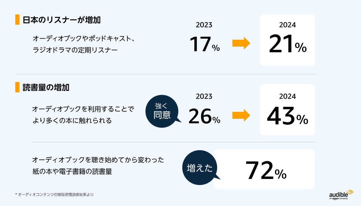 本調査によると、日本国内におけるオーディオブックリスナーのうち、「オーディオブックを利用することで、より多くの本に触れられる」に強く同意した人の割合は2023年の26%から2024年には43%に増加。さらに、72%の人が「オーディオブックを聴き始めてから、紙の本や電子書籍の読書量も増えた」と答えています。