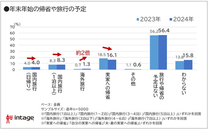 ・年末年始の予定は、国内旅行は前年並み、昨年伸びた帰省は微減、海外旅行は前年の約2倍