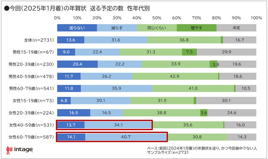 その傾向は、今まで年賀状を多く送っていたと思われる女性40代以上で顕著です(図表5)。