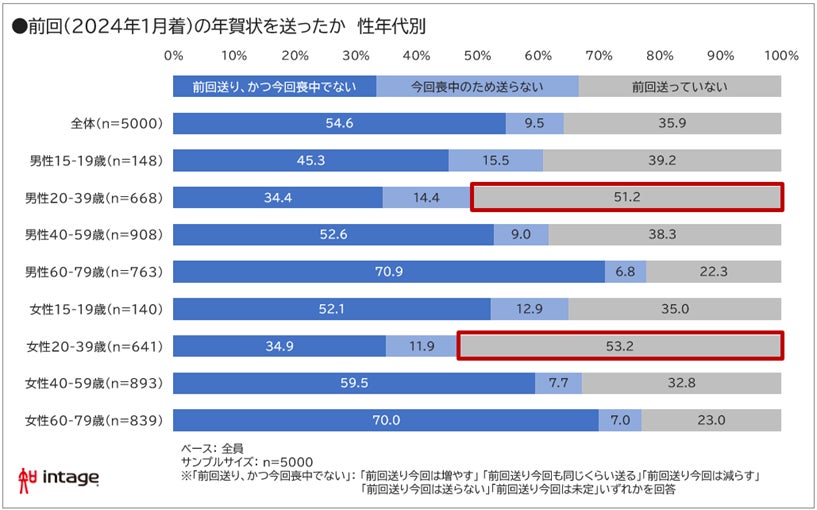 また、前回の年賀状を送ったかを年代別に見てみると、男女ともに“20-39歳”では「前回送っていない」人が半数を超えていました。郵便料金の値上げ前から年賀状を出していない人が多い世代です(図表6)。