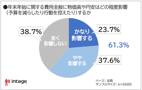 次に、ここ数年続く物価高や円安に対する意識について見てみましょう。“年末年始に関する費用全般”が「影響を受ける(「かなり影響する」+「やや影響する」)」と回答したのは、全体の61.3%でした(図表2)。