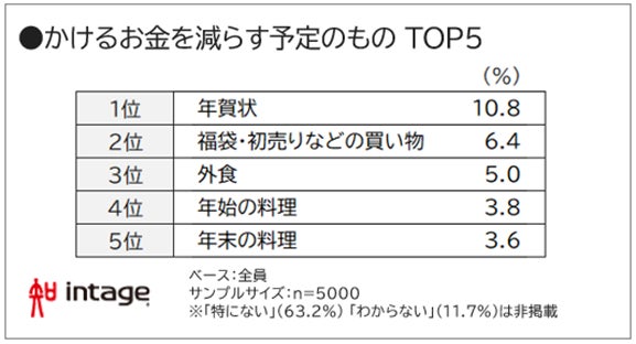 それでは、生活者はこの年末年始のどこで節約するのでしょうか。年末年始にかけるお金を減らす予定のものの1位は「年賀状」(10.8%)、2位は「福袋・初売りなどの買い物」(6.4%)、3位は「外食」(5.0%)でした。