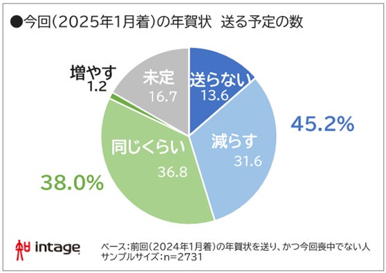 続いて、どのくらいの人が「年賀状」を送るのをやめたり、数を減らしたりするのでしょうか。前回(2024年1月着)の年賀状を送り、かつ今回喪中でない人は54.6%ですが、今回どうするかについて聞いてみました。年賀状を「送らない」または「送る数を減らす」人が45.2%で、「同じくらい送る」または「増やす」(38.0%)を大きく上回りました(図表4)。