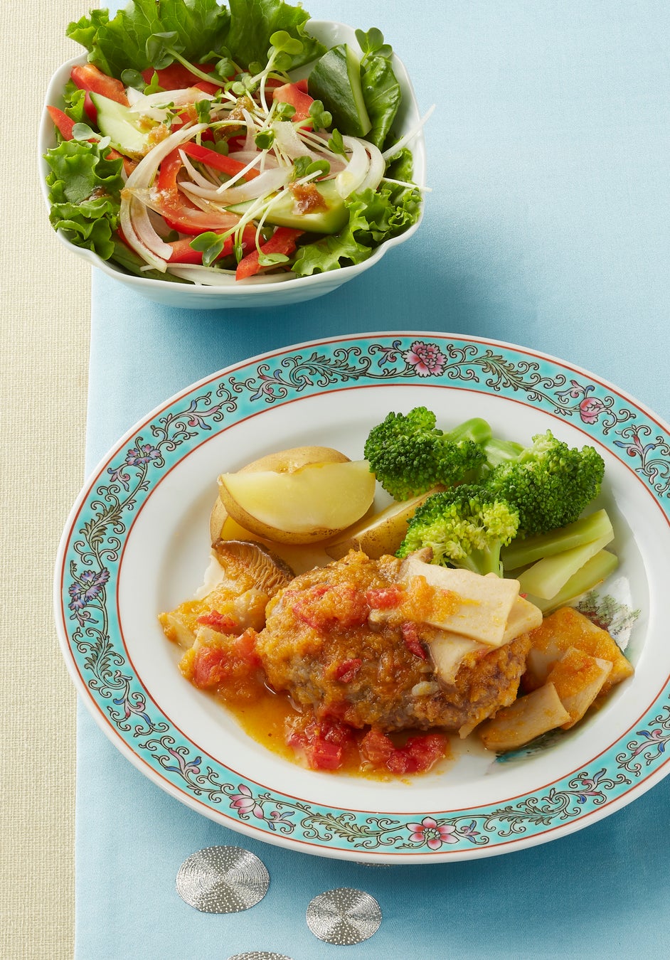 以前働いていたお店の賄い料理を簡単に作れるようアレンジ。ハンバーグのタネは、ひき肉だけでなくご飯を入れることで、ふわふわの食感に仕上げました。サラダのドレッシングは身体の内側から温めてくれる生姜を使用し、さっぱり食べられます。