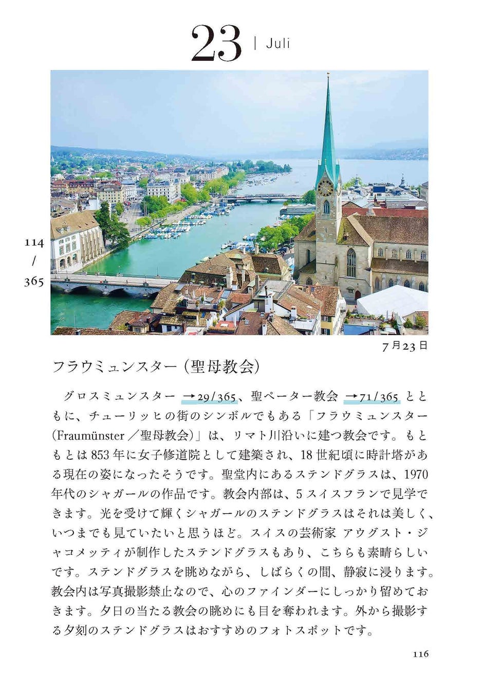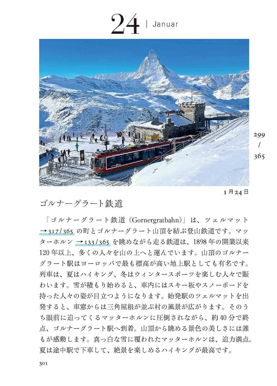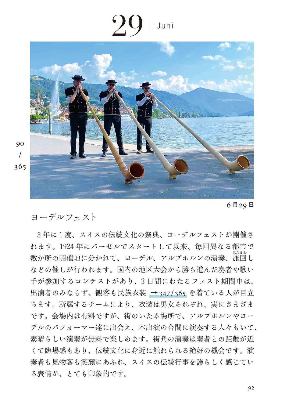 有名な観光地のことはもちろん、伝統や習慣、スイスの人々の意外な一面まで、365のテーマに沿った文章と写真は、まさにスイス尽くし!アルプスと森と湖に恵まれた小さな国の日常がたっぷり詰まっています。