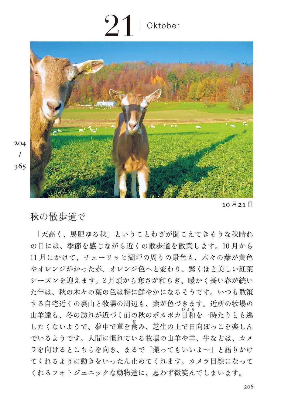 本書はそんなスイスに暮らして20年目、ブログ『スイスの街角から』で情報を発信する‘Apfel’さんこと工藤香さんが、スイスでの生活を通して気づいたこと、おすすめ情報などを綴ったエッセイです。365日の季節の移り変わりときれいな写真に思わず目を奪われる、スイス好きの方にぜひ持っていていただきたい1冊です。
