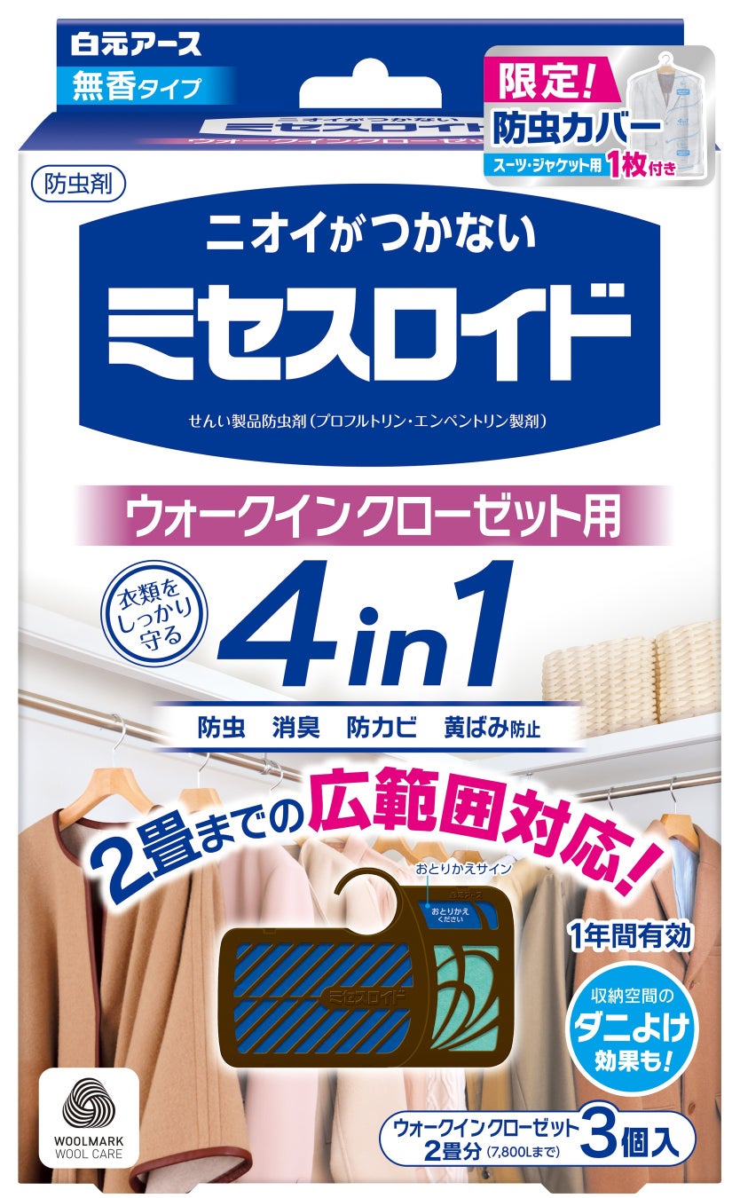 さらに、より充実した衣類・収納空間ケアを行っていただきたいという思いから、『ミセスロイド防虫カバー スーツ・ジャケット用試供品1枚』を同梱した限定企画品を発売いたします。同梱する「ミセスロイド防虫カバー」も、衣類を守る4つの機能とカバー内のダニよけ効果※2がついた多機能タイプです。※2屋内塵性ダニに対する効果