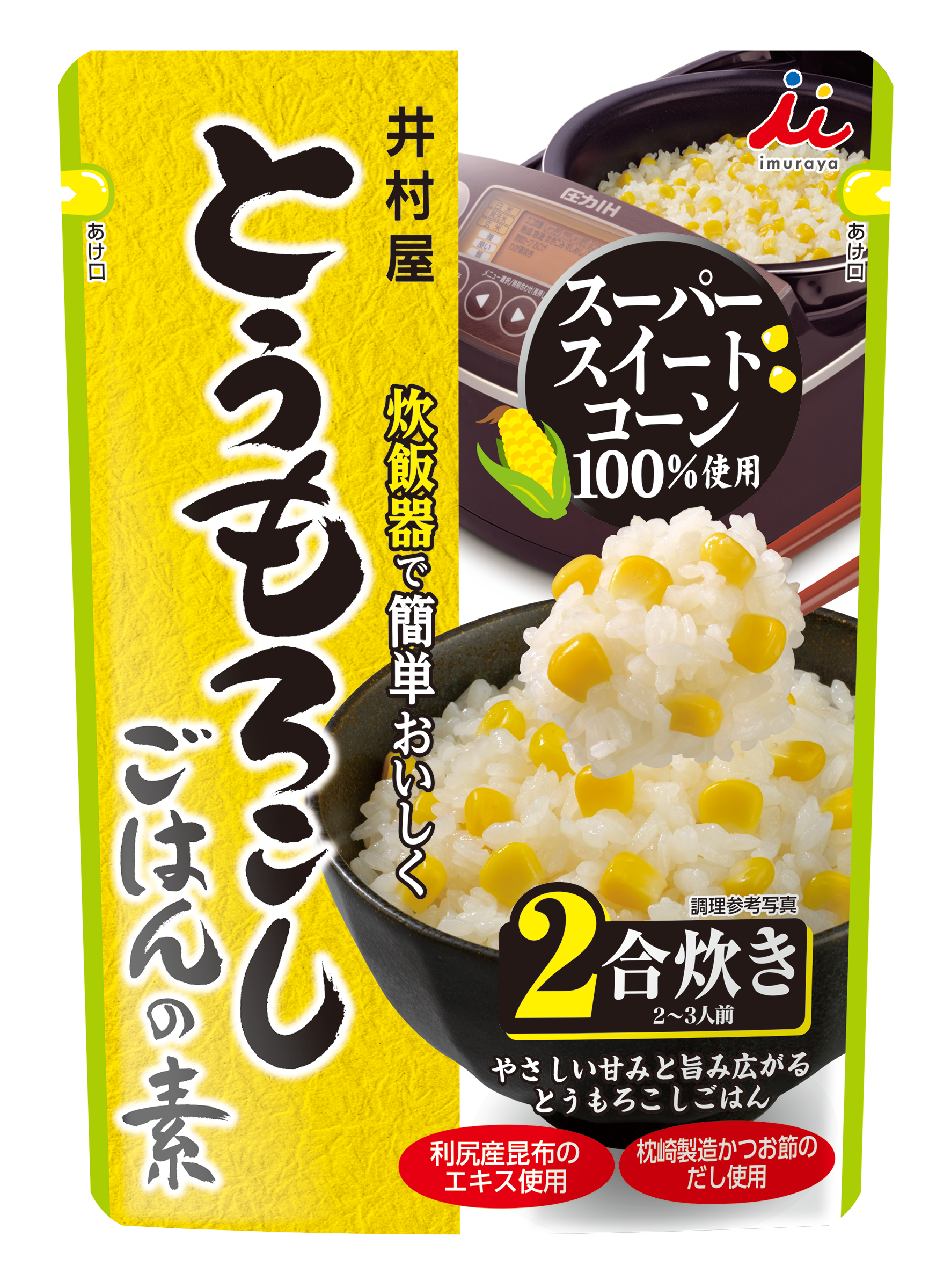 井村屋の「ごはんの素シリーズ」は、炊飯器に白米と一緒に入れて炊くだけの簡単調理で手軽にお赤飯や豆ごはんが食べられるロングセラー商品です。面倒な調理工程なしに食卓に季節の彩りを添えられることから、時短・簡便性へのニーズの高まりと合致し、お客様からの支持が高まっています。『とうもろこしごはんの素』(2合炊き)は、同シリーズの季節限定商品として発売いたします。