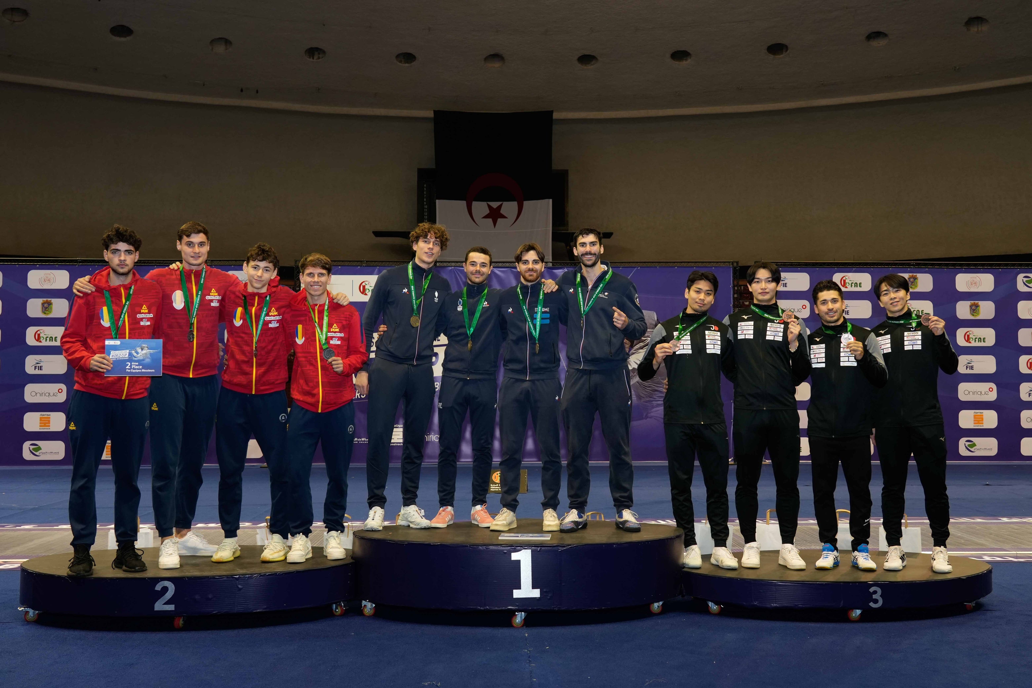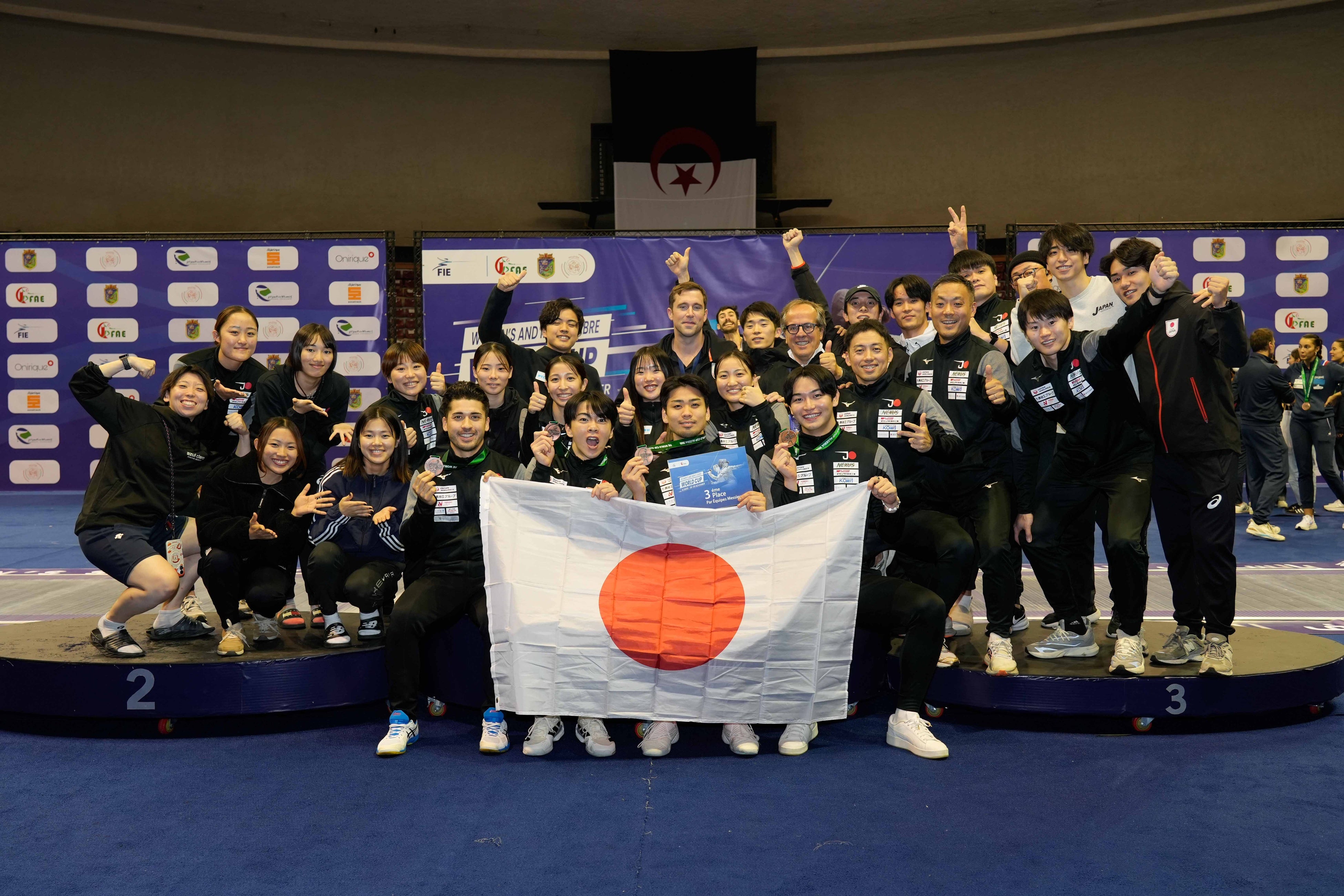 現地時間2025年11月9日(日)、アルジェリア/アルジェで開催された、ワールドカップ 男子サーブル団体にて、小久保真旺(こくぼ まお:株式会社ミキハウス)、ストリーツ海飛(すとりーつ かいと:コアスタッフ株式会社)津森志道(つもり しどう:法政大学)、坪颯登(つぼ はやと:日本体育大学/株式会社ティー・ユー・ビーアソシエイツ)のメンバーで悲願のメダルを獲得しました!
