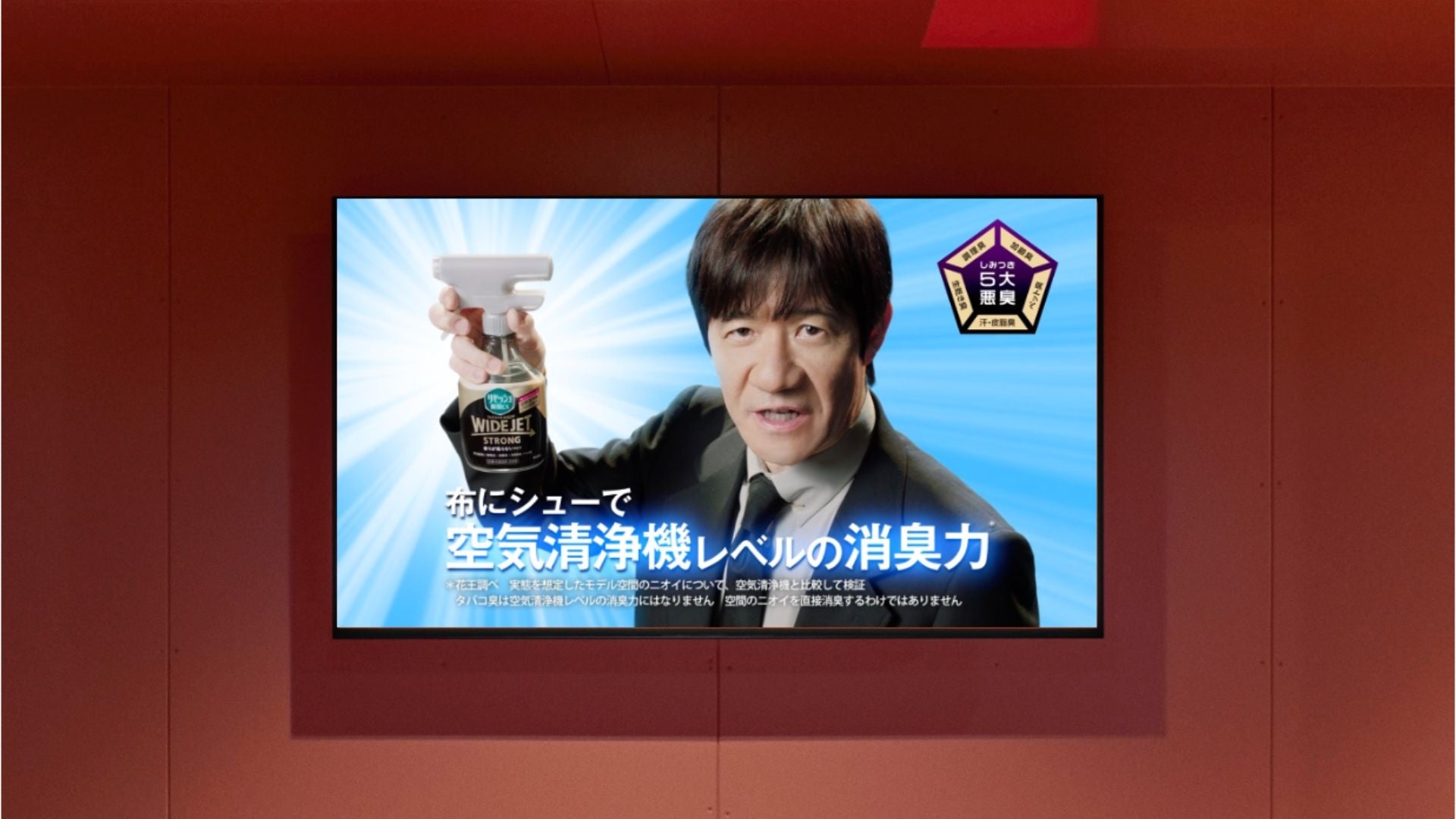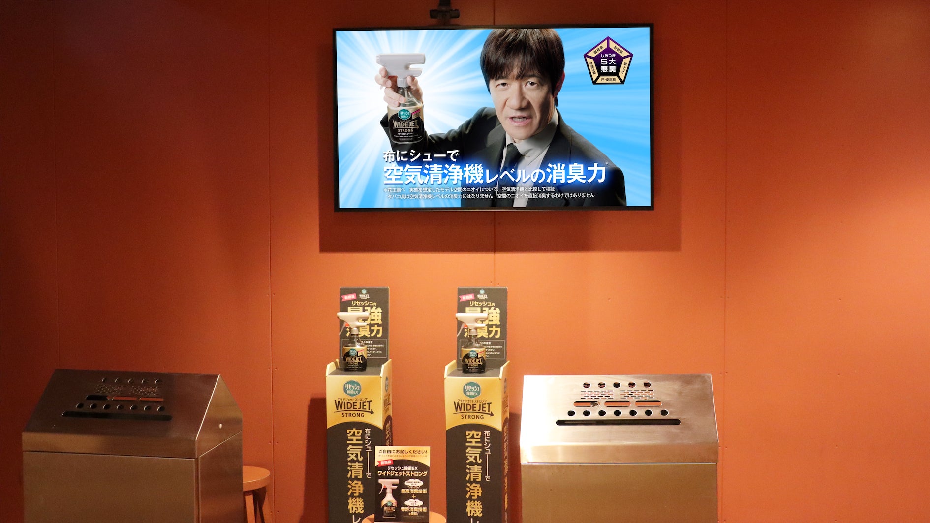 この度「BREAK」と連携した24施設の喫煙所(THE TOBACCO)を対象に、花王「リセッシュ除菌EX ワイドジェットストロング」を設置します。商品に関する動画の放映から、タバコの匂いが気になる瞬間に商品を手に取り、実際にその場で効果や使用感を体験していただくことで、視覚・聴覚・触覚で商品への理解を深めることができます。