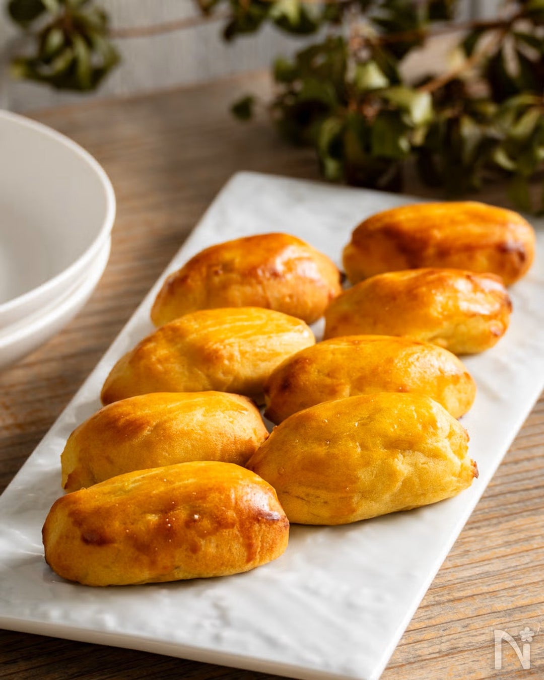 秋の定番スイーツのスイートポテト。材料はたった5つで、さつまいものホクホク感をしっかり堪能できます。焼き上がりの表面はツヤっと美しく、見た目にも華やか。子どもから大人まで幅広く喜ばれる、季節の手作りおやつです。