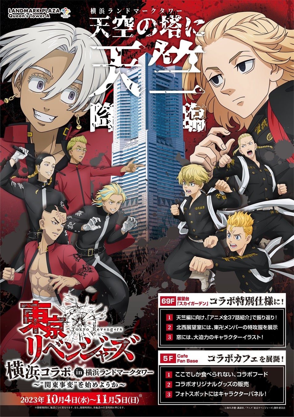 横浜ランドマークタワーは、講談社 週刊少年マガジンで連載された『東京卍リベンジャーズ』のTVアニメ新シリーズ放送の記念タイアップコラボレーションとして「東京リベンジャーズ 横浜コラボ in 横浜ランドマークタワー」を開催いたします。横浜ランドマークタワー 69階展望フロア「スカイガーデン」では、『東京リベンジャーズ』の”天竺編”につながる”8・3抗争編”から“血のハロウィン編”“聖夜決戦編”までのストーリーを振り返ることができるヒストリーコーナーに加え、東京卍會と天竺の特攻服の展示など、『東京リベンジャーズ』の世界を存分にお楽しみいただけるコンテンツをご用意しております。また、5階のコラボカフェ「Cafe Fan Base」では、フォトスポットの設置に加え、オリジナルのコラボメニューやイベントオリジナルグッズの販売を行います。