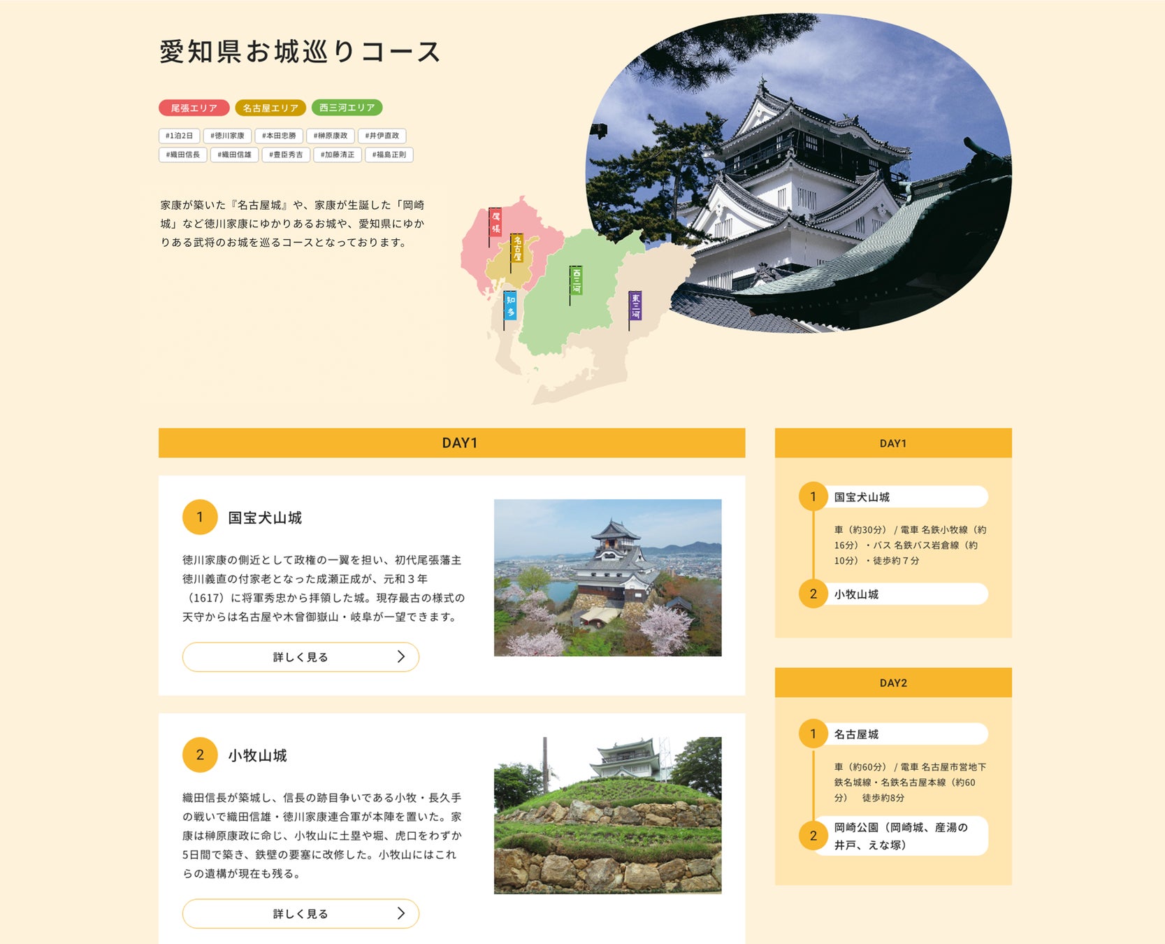 尾張、名古屋、知多、西三河、東三河の5つのエリアに分けて、戦国武将ゆかりの地を紹介。