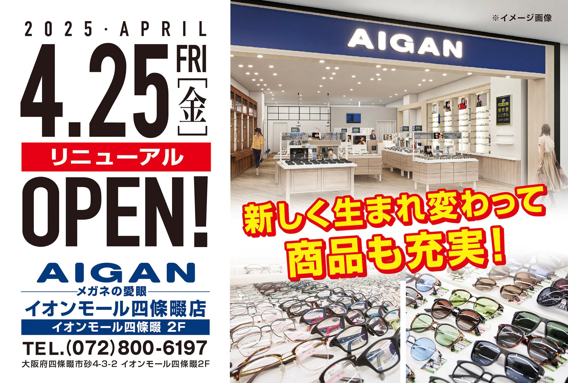 メガネ・補聴器を販売する「メガネの愛眼」及び「Aigan」 ( https://www.aigan.co.jp/ )を運営する愛眼株式会社(本社:大阪市天王寺区、代表取締役社長:佐々 昌俊)は、大阪府四條畷市の商業施設「イオンモール四條畷」2Fに「AIGAN イオンモール四條畷店」を2025年4月25日(金)、リニューアルオープンしましたことをお知らせいたします。