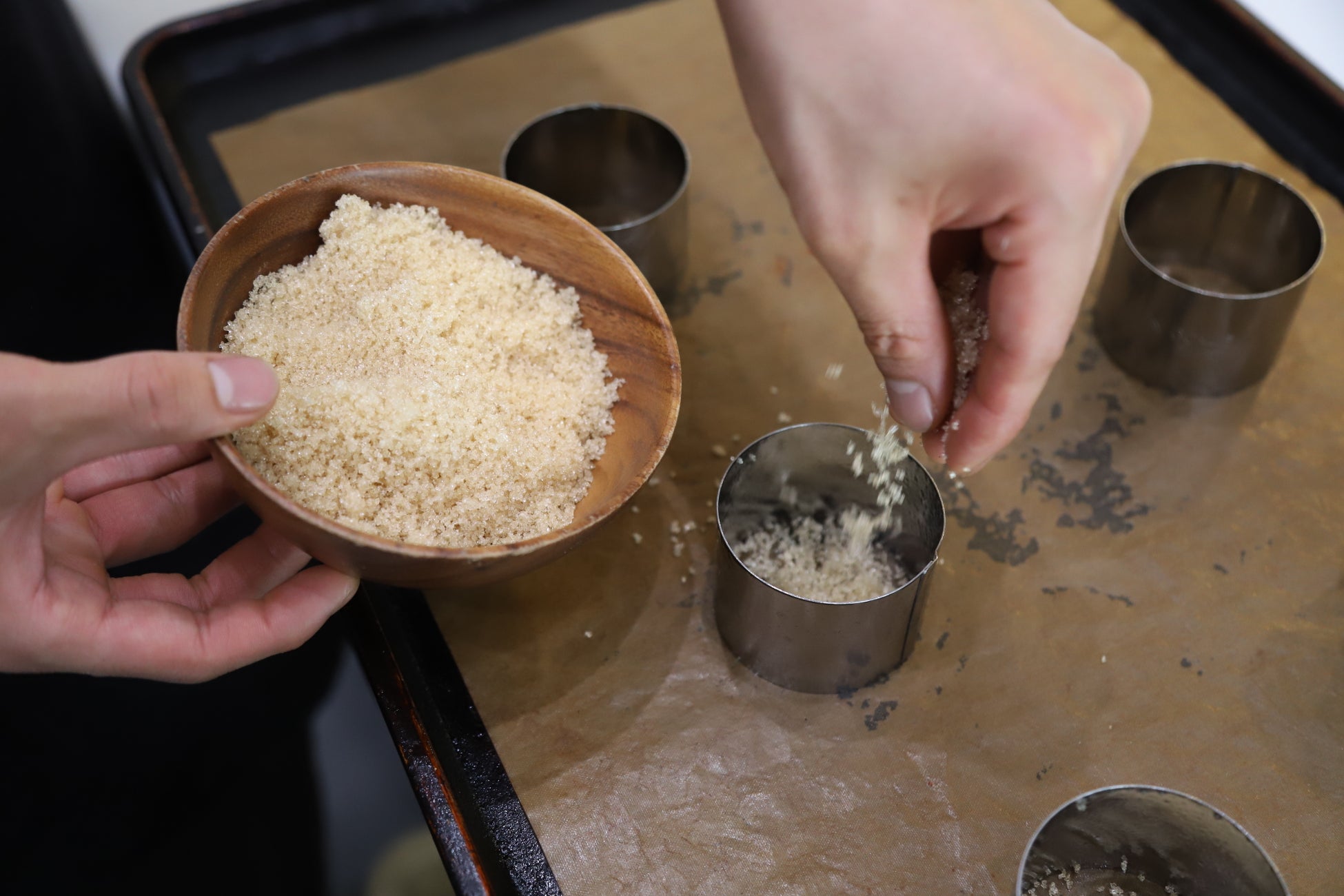 卵・牛乳・バターなどの動物性食材、乳化剤・保存料・増粘多糖類といった食品添加物を一切使用せず、有機栽培をはじめとしたナチュラルな植物性食材のみを厳選。「コムギ縞萎縮病」に対しても強い耐性を持つため、環境負荷が高い土壌消毒への依存を回避できるサステナブルな選択として国産小麦「ゆめちから」を採用し、独自に編み出した発酵時間調整や生地成形方法でふんわり・もっちりとした食感を実現しています。また、約3,000坪の緑豊かな敷地内で採れた花酵母でゆっくりと発酵させています。天然酵母ならではの旨味とコクを感じる生地の底は、粗糖でキャラメリゼし、カリっと香ばしく仕上げました。