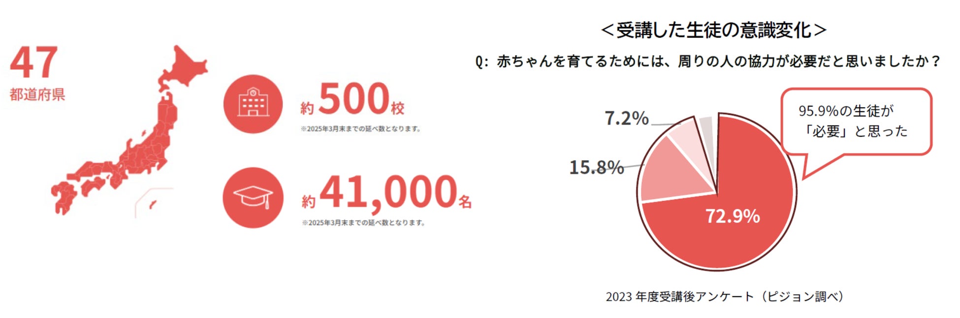 2021年9月の開始以来、これまでに全国の約500校、約41,000名 [1]の生徒に提供され、今年度も約150校での実施を予定しています。これまで全国で授業を受けた生徒に行ったアンケートでは、授業を受けたほぼすべて(95.9%)の生徒が、赤ちゃんを育てるためには周りの人の協力が必要だと認識したことがわかりました。