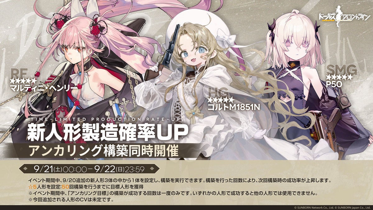 株式会社サンボーンジャパンは、スマホ向け戦略型シミュレーションゲーム『ドールズフロントライン(以下、「ドルフロ」)』において、9月20日(金)メンテナンス後より、新人形を3名追加し入手確率のUPイベントを開催することをお知らせいたします。