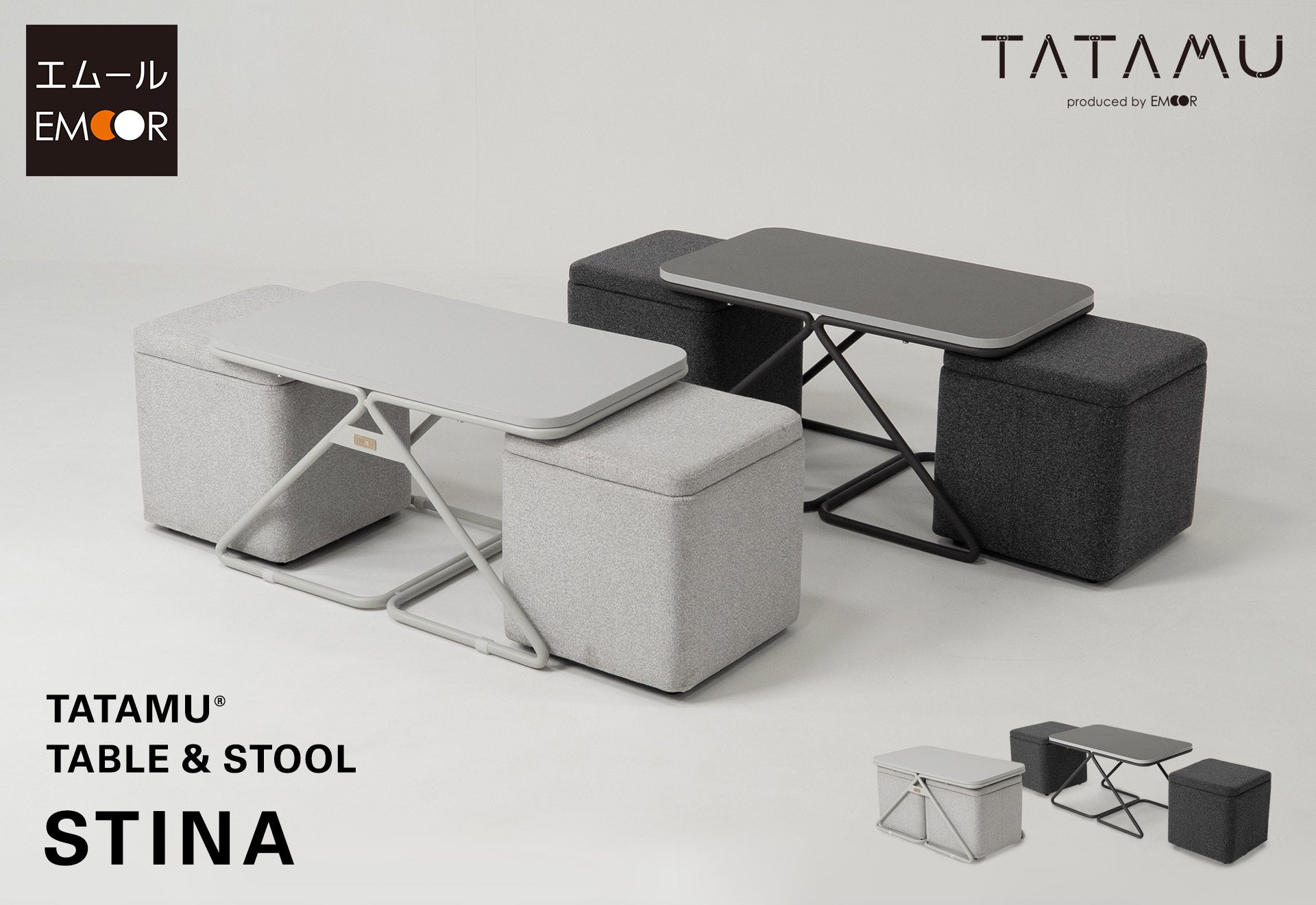 人間工学に基づいた空間有用性と安全な使い心地を両立するトランスフォーム家具ブランドTATAMUⓇを展開する株式会社エムール(東京都立川市:代表取締役 高橋 幸司)は、2026年4月7日より、テーブル&スツール『STINA』(以下、 スティナ)の販売を開始しました。