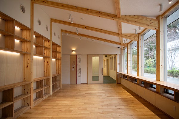 ・木が心身に与える癒しの効果に着目し、エントランスホールや多目的室、事務室、医務室は柱梁の一部を現し※2としています。壁面や床、天井、什器などの内装にも積極的に木目のデザインを取り入れました。住友林業筑波研究所の研究で、木や木質空間には木目や香りによるリラックス効果があり、不安やイライラなどを軽減する効果があることが分かっています。