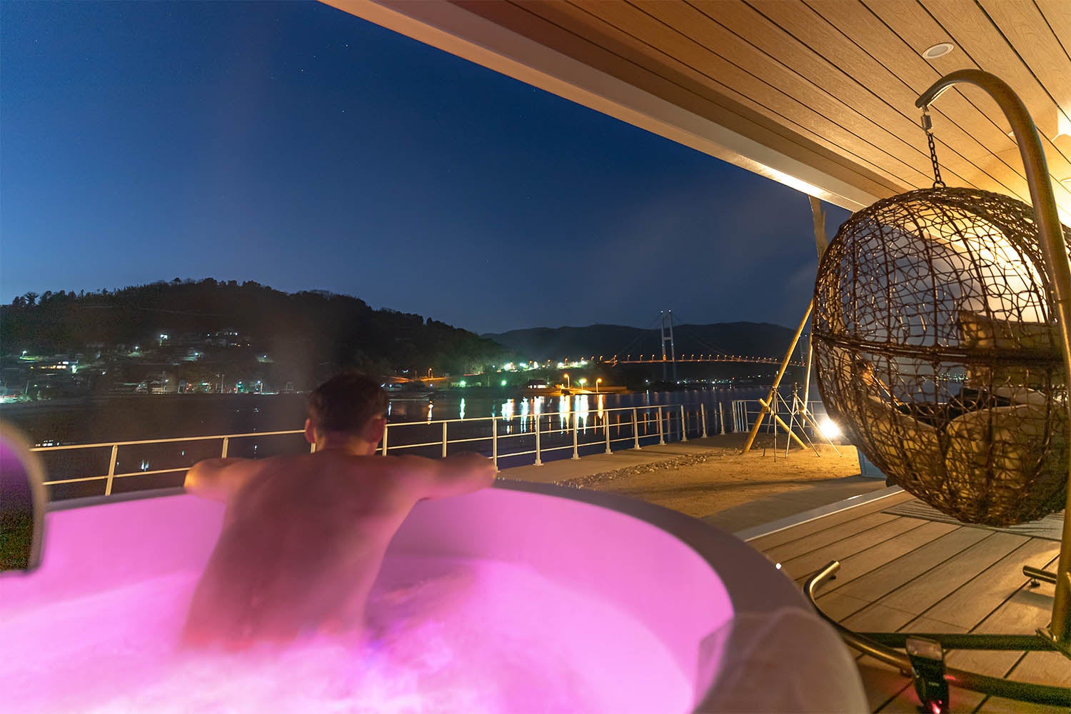 客室には各棟専用の屋外ジャグジーをご用意。目の前に広がる瀬戸内海のパノラマビュー。