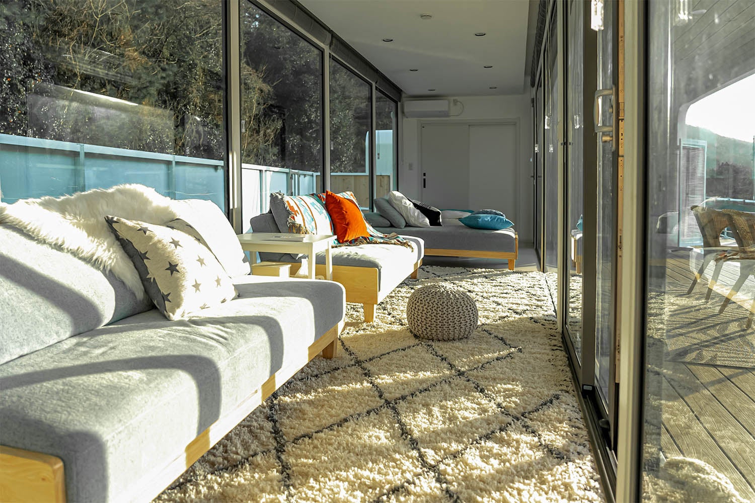 客室には山側、海側の両サイドをガラス張りにした大胆なデザインで