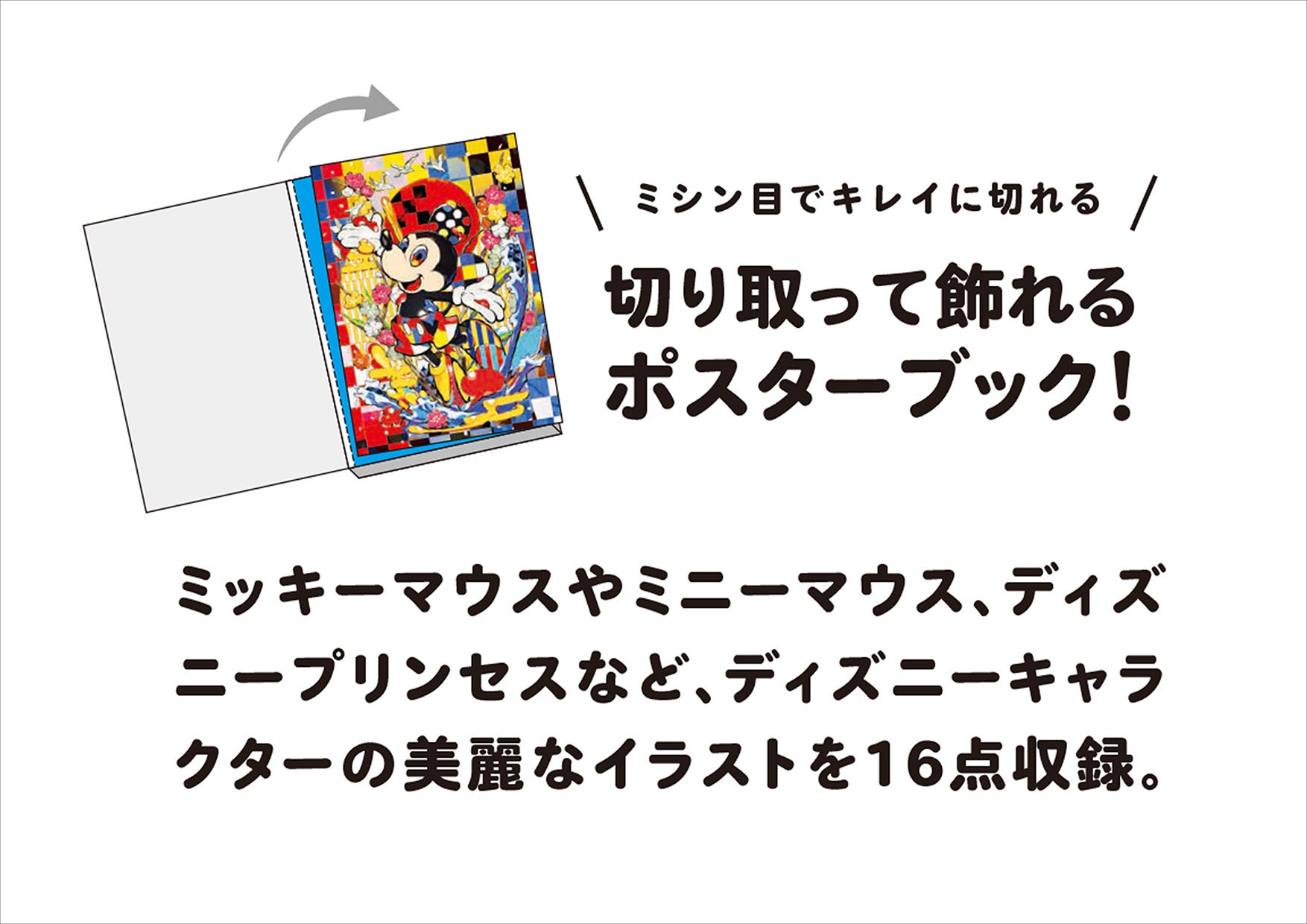 本書では、ミッキーマウス、ミニーマウス、ディズニープリンセスをはじめとした人気キャラクターたちを、Mika Pikazoならではの大胆な色彩とダイナミックな構図で表現。全16点のイラストを切り取って飾れる“ポスター仕様”として収録しています。