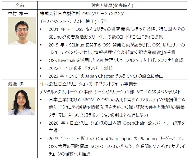 日立は、LFの創立当初からスポンサーとしてコミュニティをサポートし、オープンソースソフトウェア(以下、OSS)の開発貢献やイベントの運営などに取り組んできました。日立の中村 雄一は、20年以上OSSコミュニティ活動に携わり、近年LFのボードメンバーとして国内コミュニティとCloud Native Computing Foundation(以下、CNCF)などの関連団体との橋渡しを行い、Cloud Native Community Japan(以下、CNCJ)設立の発起人を務めました*1。日立ソリューションズの渡邊 歩は、日本企業におけるSBOM(ソフトウェア部品表)の普及や企業間のコラボレーションの創出と推進に尽力し、OpenChain*2 JapanのPlanningリーダーを務めています。これらの活動実績が、プロジェクトやコミュニティの関係者から、第一線で特に顕著なリーダーシップを発揮していると評価され、LF Japanの初代エバンジェリスト選出に至りました。