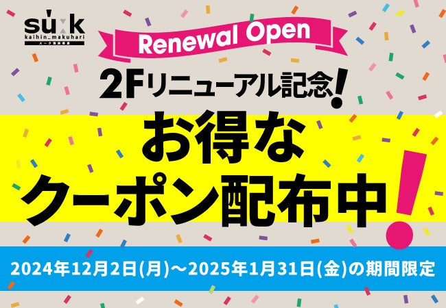 スーク海浜幕張2Fリニューアル記念!特設サイトを開設し、いつもご利用いただいてる皆様へお得なクーポン配布中。2024年12月2日(月)〜2025年1月31日(金)の期間限定
